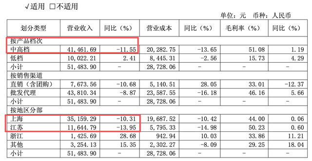 此外,金枫酒业市集呈现“大本营减弱、外埠承压”样式,上海市集动作中枢基本盘,2025年竣事销售收入3.52亿元,同比下滑朝上10%,占主贸易务收入比重约68%,市集份额濒临腹地竞品与外来品牌双重挤压;江苏中枢市集收入1.16亿元,同比下滑约14%,本期占比22.62%,渠谈渗入乏力;其他省外市集拓展进展逐渐,销售收入系数占比9%足下,仅浙江等少数区域略有增长,寰宇化布局迟迟未能遏止。