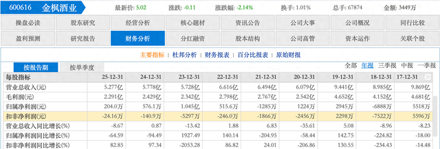 更进一步来看,金枫酒业2025年扣非后净利润为-24.16万元,已深陷聚首六年的损失之中。